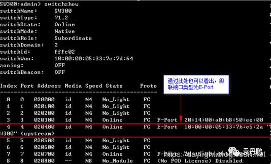 交换机级联成功端口状态为Online,端口类型会变成为E-Port,主交换机后面会标有 (upstream),下级交换机会显示 (downstream)状态,否则就是级联不成功。 |