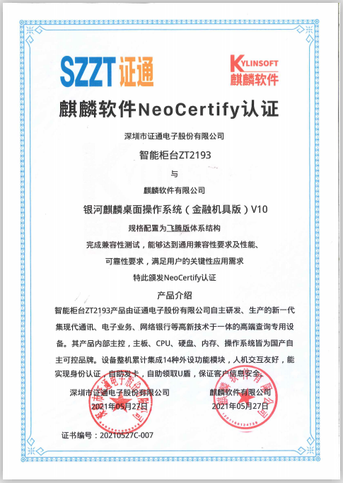 深圳证通致力于电子化领域产品与服务自主创新,是国内领先对的以自助设备为核心的解决方案提供商。证通在自助终端行业耕耘20年,产品及方案覆盖金融、医疗、政务、交通等多个领域。随着国家信息安全,自主创新的建设要求越来越清晰,证通开始在金融、政务、医疗等多个领域开始研发、测试国产化创新自助终端。基于此产品的需求,证通电子与麒麟软件建立战略性合作,在机具领域解决方案、试点推广、标准合作、机具设备等方面进行全方位的合作,为推动自助终端的自主创新国产化加大合力。目前,麒麟软件已与深圳证通智能柜台ZT2193等多款机具产品完成兼容性测试,进一步拓宽及完善双方的业务边界和软硬件生态的融合。本次战略合作协议的签署,是在国产金融机具领域的又一次创新突破。双方将共享资源优势,加快双方在相关技术、产品、市场等方面的进一步完善及联动,协同促进业务高质量发展,提升双方在客户及市场中的竞争力和影响力,共同推进金融机具国产化进程。