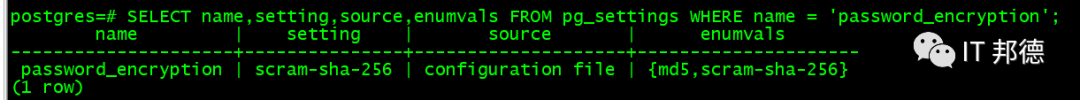 postgres=# SELECT name,setting,source,enumvals FROM pg_settings WHERE name = 'password_encryption';