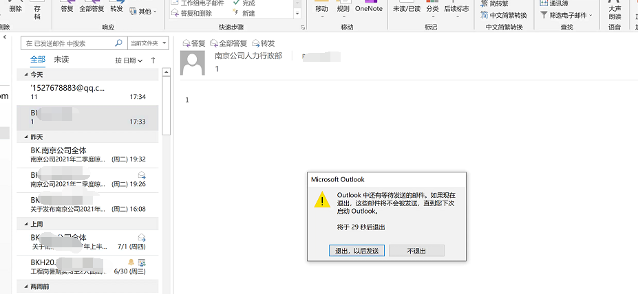 Outlook中还有等待发送的邮件。如果现在退出,这些邮件将不会被发送,直到您下次启动Outlook。