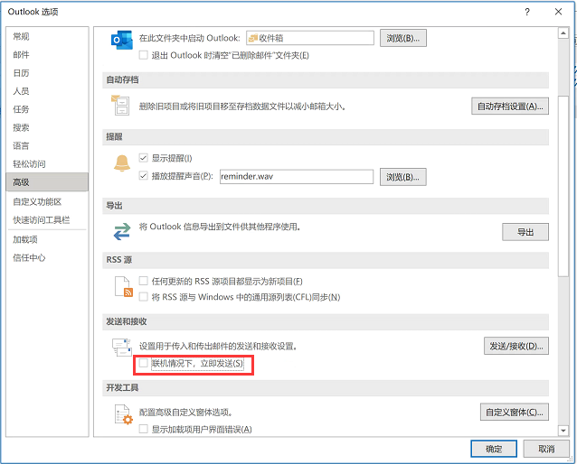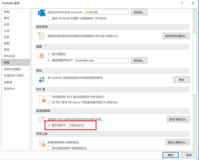 当关掉Outlook后,再次打开outlook,上面勾选择的联机情况下,立即发送(S)前面的勾又被自动去掉了。