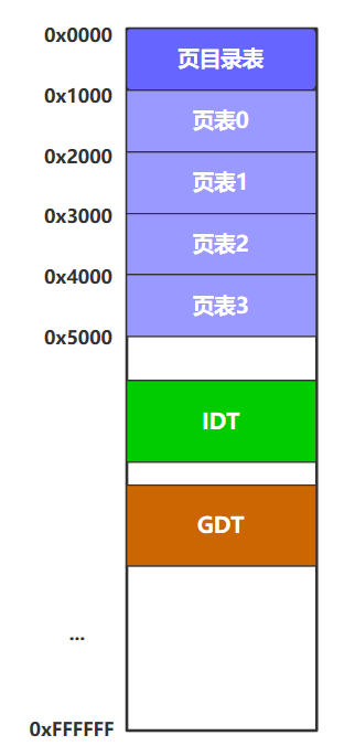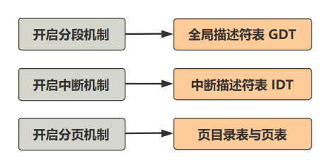 除去一些加载和跳转,最重要的其实就是使 CPU 从实模式进入保护模式,并开启了分段机制、中断机制和分页机制,而为了开启这三个机制分别在内存中设置了全局描述符表(GDT)、中断描述符表(IDT)和页目录表与页表。