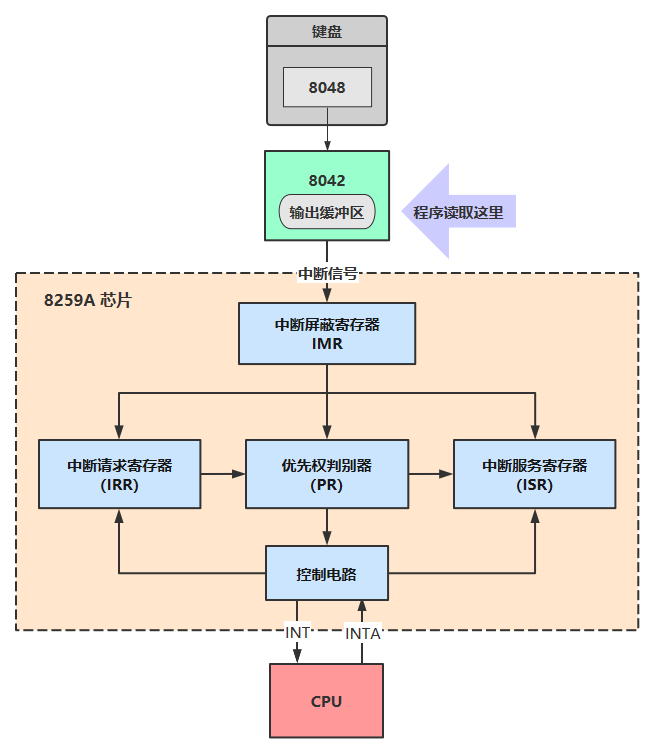 当按下键盘中的按键时,键盘设备便会将按键的编号存储在输出缓冲区,等待程序读取。同时发送信号给 8259A 芯片的指定引脚(IRQ1 号引脚)。