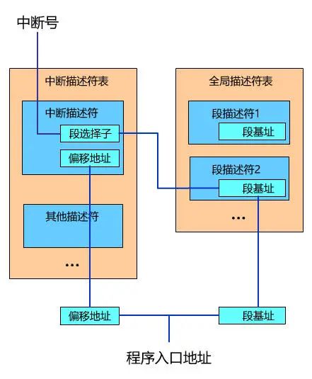 CPU 收到了这个中断号后,会去我们之前设置好的中断描述符表中,寻找这个中断号对应的中断描述符,从中取出段选择子和偏移地址,最终经过分段和分页机制,转化成物理地址,这个物理地址就是中断处理程序的内存起始地址,CPU 会将跳到这个地址上开始执行程序。过程如下。
