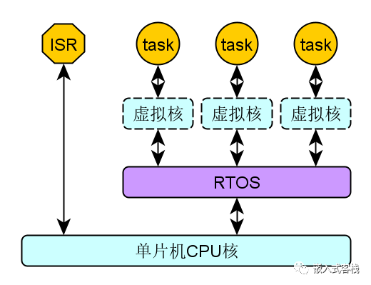 对于单片机而言,一般只有一个核,RTOS的主要作用是将用户多任务进行管理,在物理CPU核上调度管理。所以为了方便理解,可以将RTOS的调度管理器,看成是将硬件CPU核通过软件的办法为每一个应用任务虚拟出一个软核。这样就使每个任务看起来都拥有一个CPU核,这样从时间维度上看起来多任务是并行的,而事实上这种并行是伪并行。