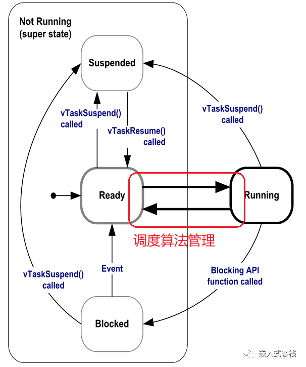 Ready: 就绪态,就是指任务可以被调度器装载进CPU核运行的状态,但是还没有被装载进CPU核。为什么有这样一个就绪态呢?前面说了,RTOS主要作用就是多任务的调度管理。那么就绪的任务就有可能是多个,也就是说在同一时刻,多个任务有可能都就绪了,至于调度器究竟让哪一个任务先运行呢,这就是调度器调度算法的职责了,根据其内部的调度算法策略进行调度管理。