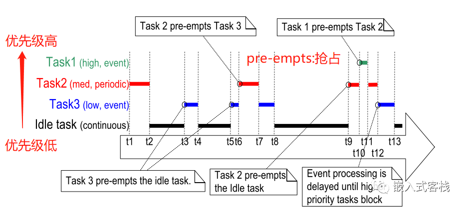 上面说到抢占式调度算法,看下面这个图就比较好理解了,在图中所示的时间点,高优先级的任务一旦就绪则会马上抢占低优先级任务。