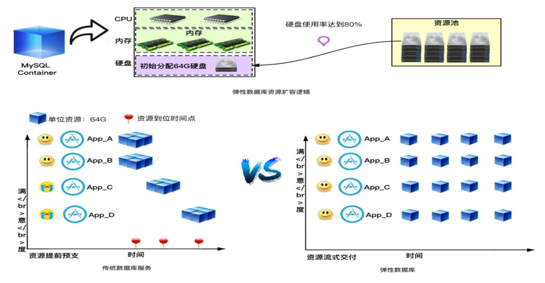 首先,可靠性上,存储是有冗余保护的,可靠性高于服务器;其次,容器与外置存储结合能实现跨物理机的漂移,故障恢复不需要全量恢复数据,故障降级时间大幅度缩减;同时,计算、存储解耦实现按需扩容,资源利用效率提升,整体成本下降50%。