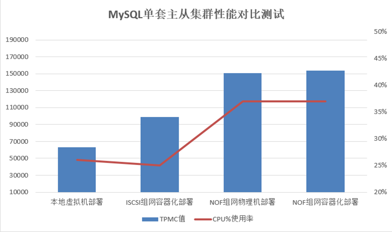 2、相同MySQL参数下,NOF容器化部署是ISCSI容器化部署的1.5倍,同时CPU使用率也提高了1.5倍,这也符合测试结果中体现的TPMC值与CPU使用率成正相关的关系。这个结果也反映出NOF组网相比于ISCSI组网,可以达到更高的性能上限。