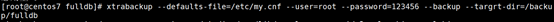 xtrabackup --defaults-file=/etc/my.cnf --user=root --password=123456 --backup --target-dir=/backup/fulldb