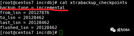 可查看xtrabackup节点信息,(xtrabackup_checkpoints),可以看到backup_type(备份类型)=incremental,则为增量备份。
