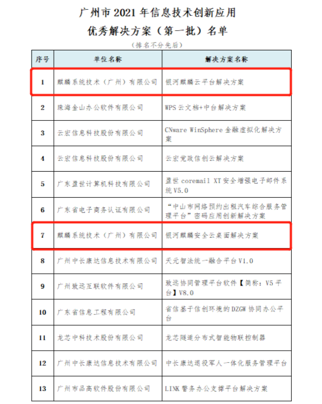 8月5日,广州市信息技术应用创新联盟公布《广州市2021年信息技术创新应用优秀解决方案(第一批)名单》,麒麟软件的银河麒麟云平台解决方案、银河麒麟安全云桌面解决方案凭借其优越的产品性能和多年信息技术应用创新建设成果的积累,在众多优秀方案中脱颖而出,成功入选!