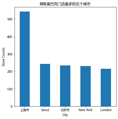 coffee.City.value_counts().head().plot(kind='bar',rot=0)