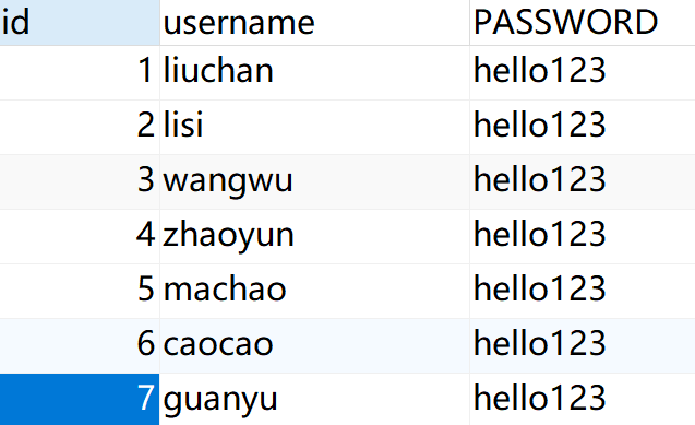 下面给出查询语句需要用到的表数据,一共七条数据。