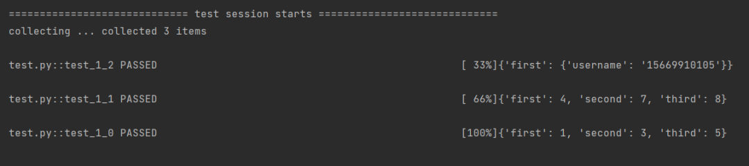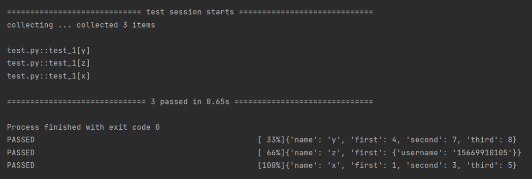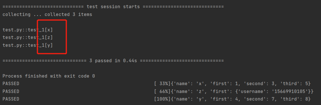 import pytestdatas = [{'name': 'x','first': 1, 'second': 3, 'third': 5},{'name': 'y','first': 4, 'second': 7, 'third': 8},{'name': 'z',"first": {'username': '15669910105'}}]@pytest.fixture(params=datas,ids=[data['name'] for data in datas])def fixture_param(request): #参数化return request.paramdef test_1(fixture_param): #调用print(fixture_param)if __name__ == '__main__':pytest.main(['-s', 'test.py'])