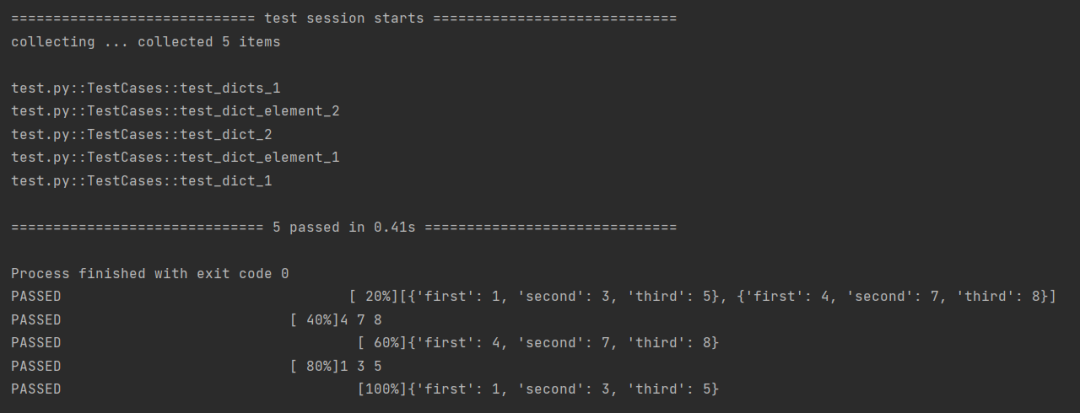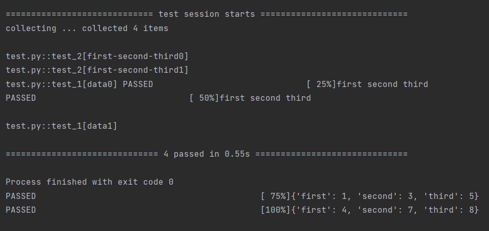 import pytestdatas = [{'first': 1, 'second': 3, 'third': 5},{'first': 4, 'second': 7, 'third': 8},#{"first": {'username': '15669910105'}}]@pytest.mark.parametrize("data",datas)def test_1(data):print(data)@pytest.mark.parametrize("data1,data2,data3",datas)def test_2(data1,data2,data3):print(data1,data2,data3)if __name__ == '__main__':pytest.main(['-s', 'test.py'])