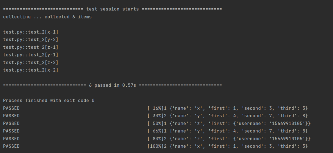 import pytestdatas = [{'name': 'x','first': 1, 'second': 3, 'third': 5},{'name': 'y','first': 4, 'second': 7, 'third': 8},{'name': 'z',"first": {'username': '15669910105'}}]@pytest.fixture(params=datas,ids=[data['name'] for data in datas])def fixture_param(request): #参数化return request.param@pytest.mark.parametrize("a",[1,2])def test_2(a,fixture_param): #调用print(a,fixture_param)if __name__ == '__main__':pytest.main(['-s', 'test.py'])