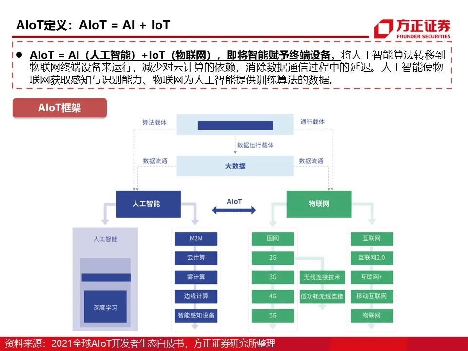 1. AIoT= AI(人工智能)+IoT(物联网),即将智能赋予终端设备。将人工智能算法转移到物联网终端设备运行,减少对云计算的依赖,消除数据通信过程的延迟。人工智能使物联网获取感知与识别能力、物联网为人工智能提供训练算法的数据。