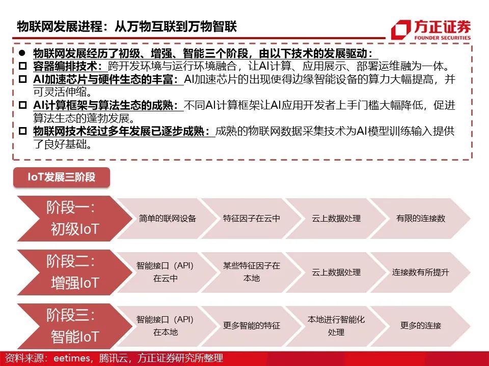物联网发展经历了初级、增强、智能三个阶段,由以下技术的发展驱动: