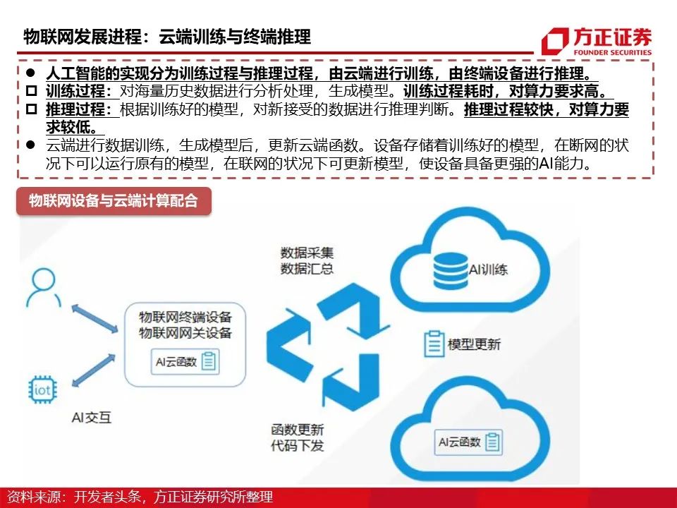 人工智能的实现分为训练过程与推理过程,由云端进行训练,由终端设备进行推理,从而实现云边协同。