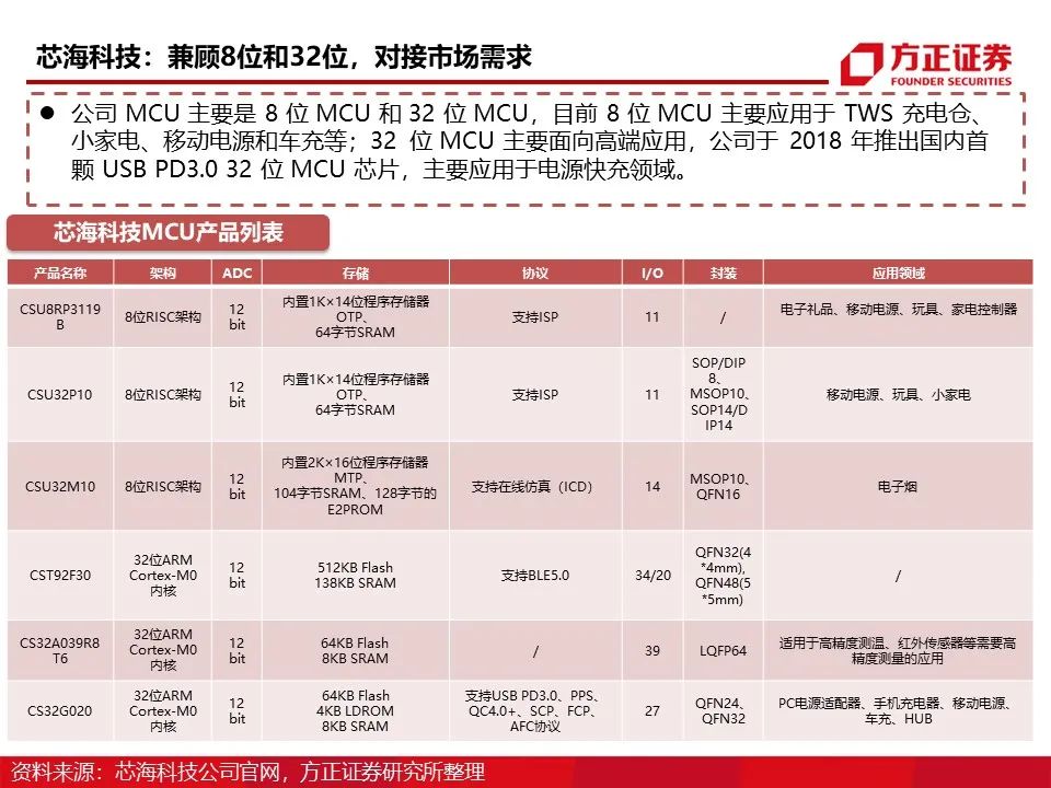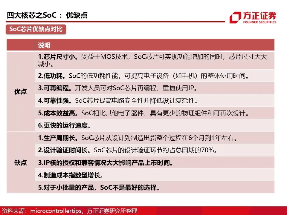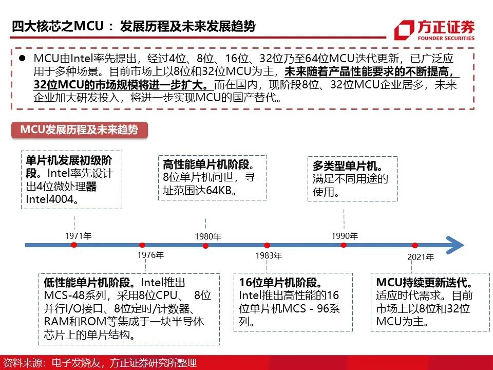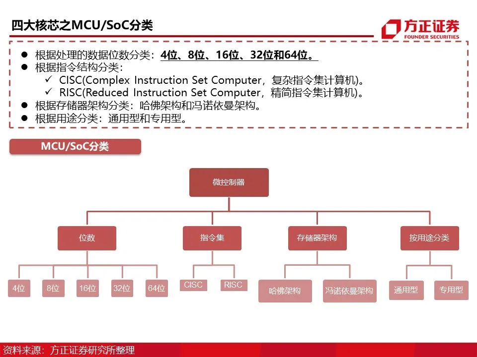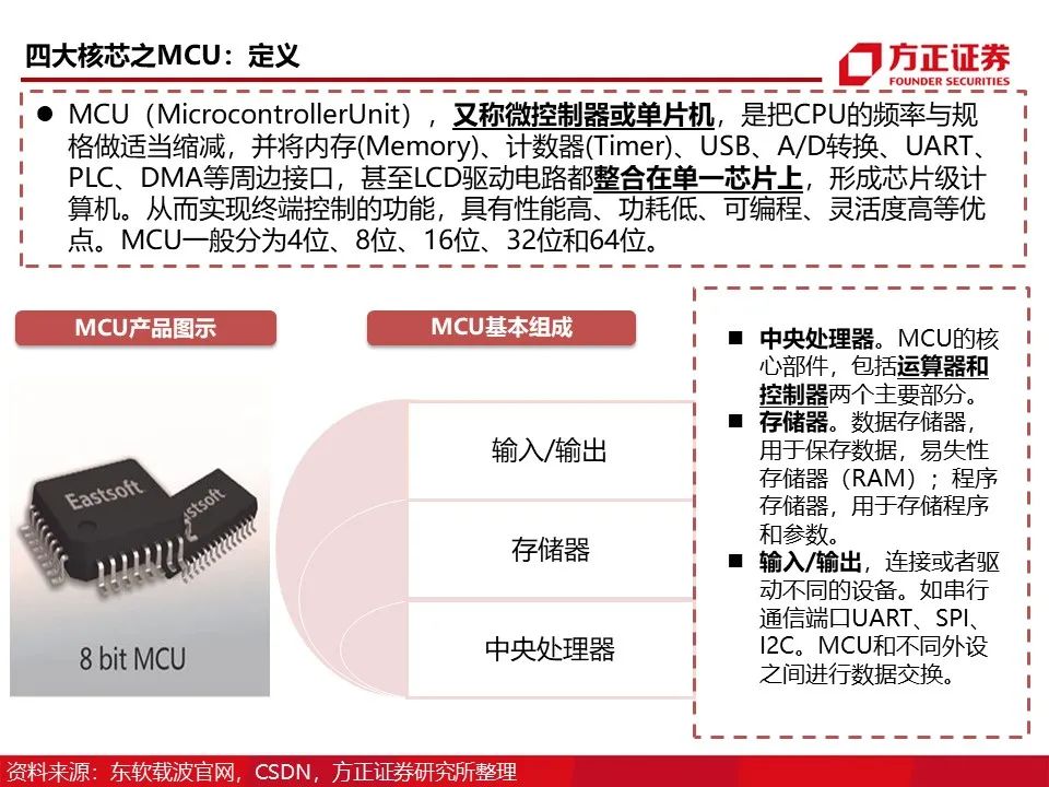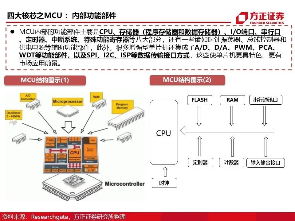 MCU:数据收集与控制执行的中心,辅助SoC实现智能化。MCU又称微控制器或单片机,是把CPU的频率与规格做适当缩减,并将内存(Memory)、计数器(Timer)、USB、A/D转换、UART、PLC、DMA等周边接口,甚至LCD驱动电路都整合在单一芯片上,形成芯片级计算机。