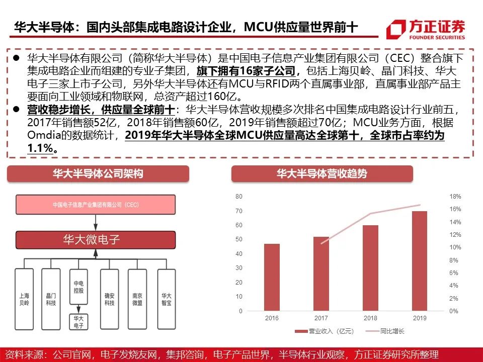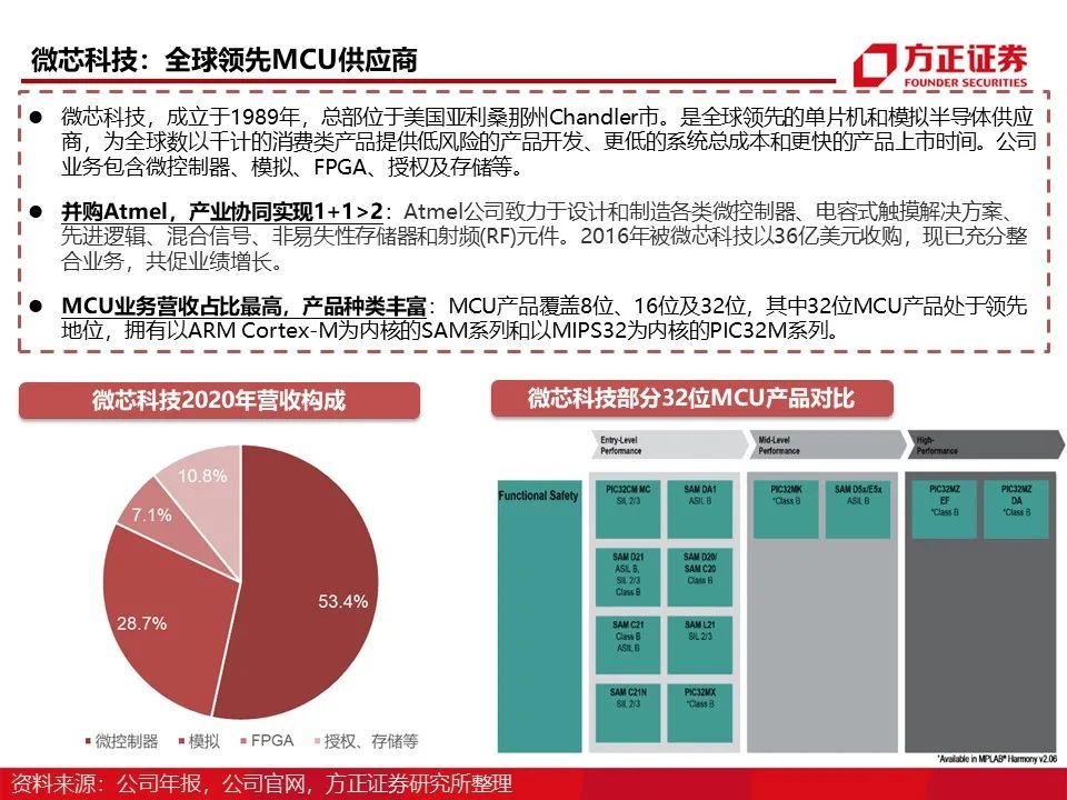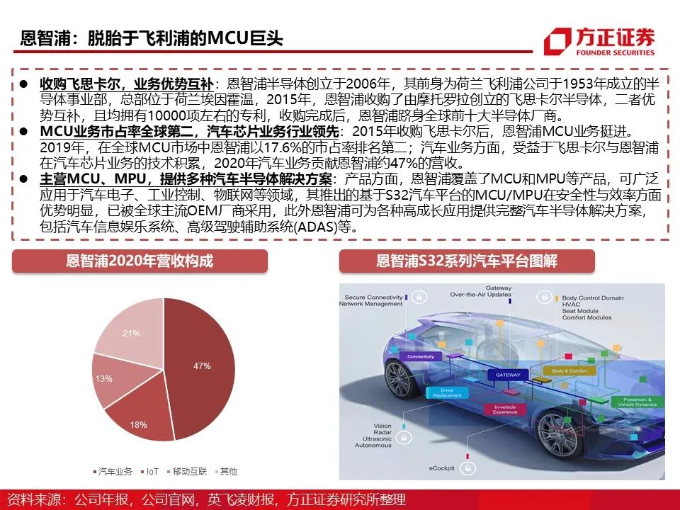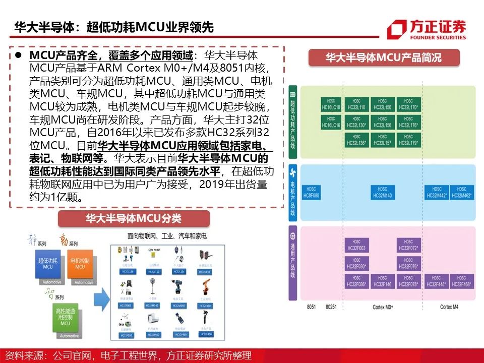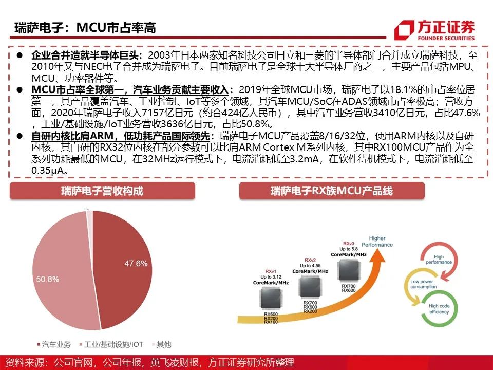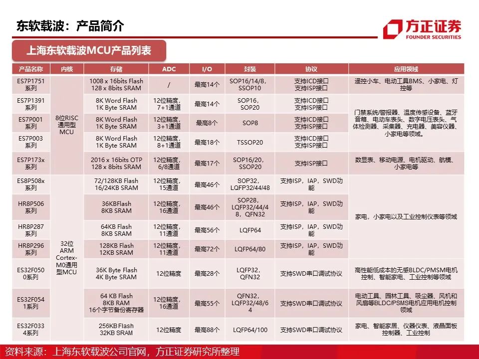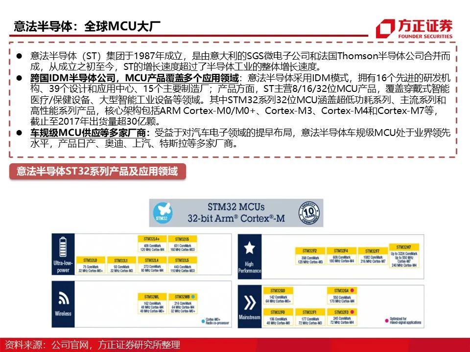 MCU:数据收集与控制执行的中心,辅助SoC实现智能化。MCU又称微控制器或单片机,是把CPU的频率与规格做适当缩减,并将内存(Memory)、计数器(Timer)、USB、A/D转换、UART、PLC、DMA等周边接口,甚至LCD驱动电路都整合在单一芯片上,形成芯片级计算机。