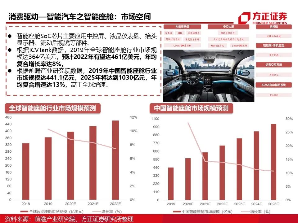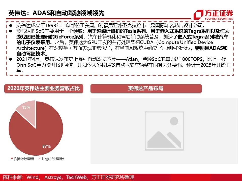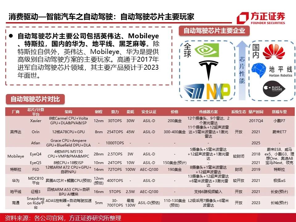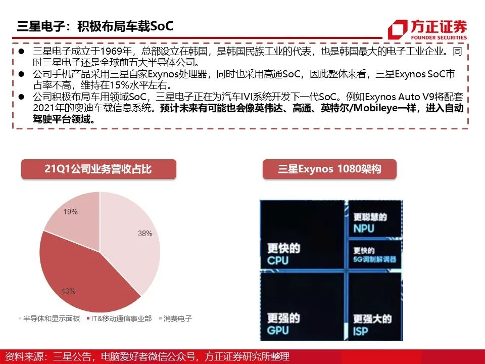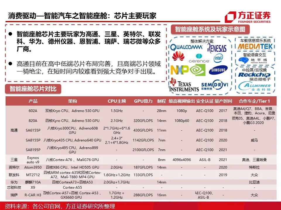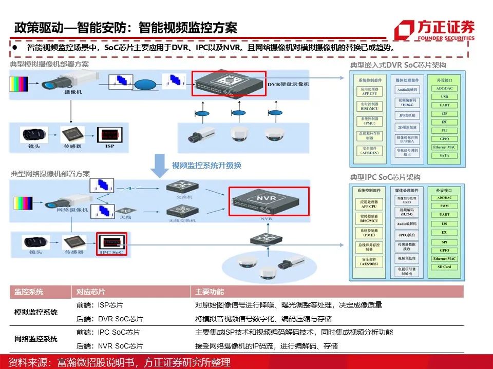 SoC:数据运算处理中心,实现智能化的关键。SoC芯片(System on Chip)又称系统级芯片,片上系统。是将系统关键部件集成在一块芯片上,可以实现完整系统功能的芯片电路。