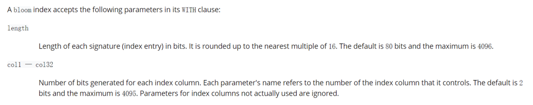 我们可以通过提高签名长度和每列的位数,让bloom index减少误报,但是缺点就是需要更多的存储空间。