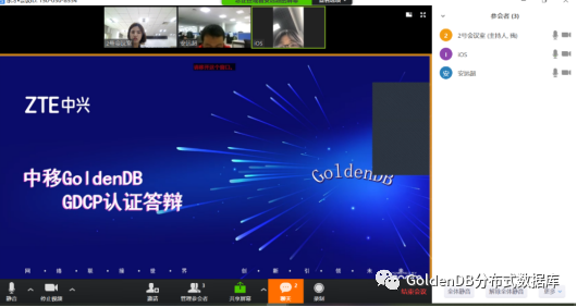 阶段3:答辩。中兴通讯为通过认证考试的学员安排了线上答辩环节。答辩学员在特定时间接入中兴直播平台,由中兴通讯安排学院和GoldenDB产品线双评委为考生进行打分,最终产生答辩结果。