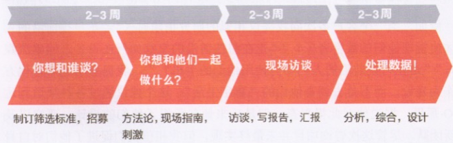 在准备开始之前,对用户访谈的工作需要有个整体概念,其大致可分为如上几个步骤。其中的上面的时间可随不同访谈类型而有所差异。下面可基于此做些前期准备工作了。