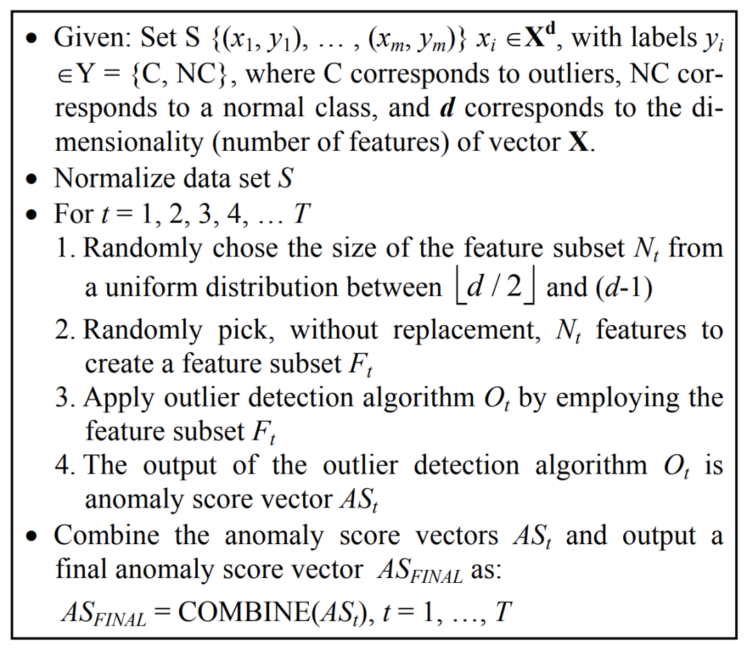 1. 选择基检测器。这些基本检测器可以彼此完全不同,或不同的参数设置,或使用不同采样的子数据集。Feature Bagging常用LOF算法为基算法。下图是Feature Bagging的通用算法: