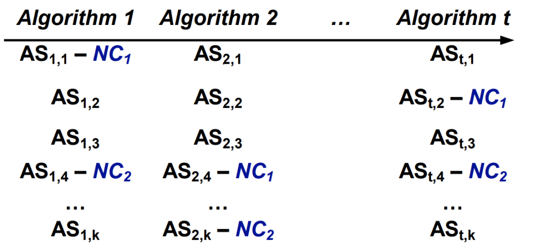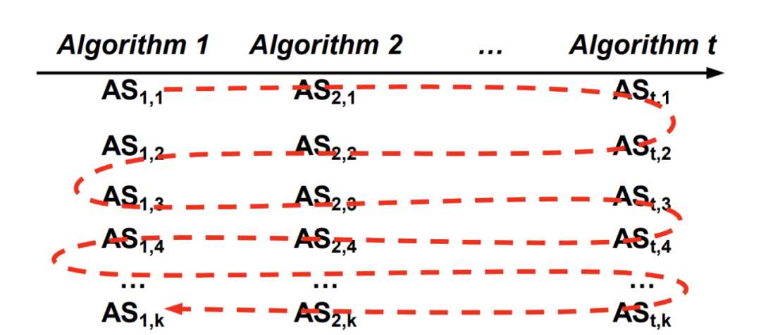 在将所有异常值得分向量排序为之后,广度优先方法只需从所有异常值检测算法中获取异常值最高的数据记录(得分为,得分为,得分为,…,得分为),并将其索引插入向量中,然后获取异常得分第二高的数据记录(下图中的得分为、、、……),并将其索引附加到向量的末尾,依此类推。如果当前数据记录的索引已在向量中,则不会再次追加该索引。