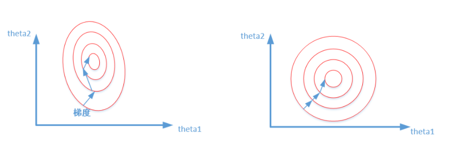 前者是没有经过归一化的,在梯度下降的过程中,走的路径更加的曲折,而第二个图明显路径更加平缓,收敛速度更快。