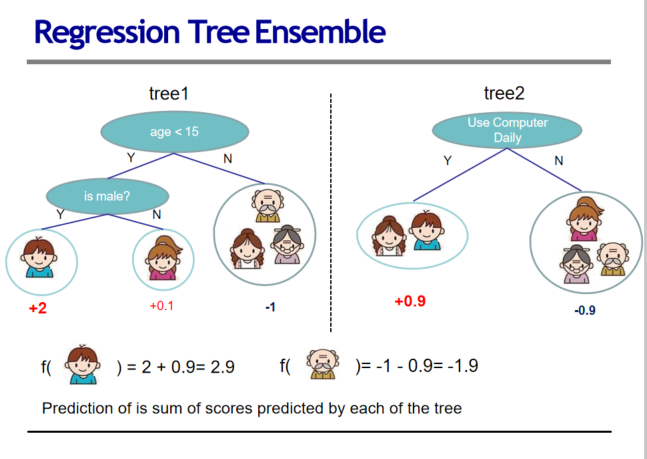 不断地添加树,不断地进行特征分裂来生长一棵树,每次添加一个树,其实是学习一个新函数f(x),去拟合上次预测的残差。 当我们训练完成得到k棵树,我们要预测一个样本的分数,其实就是根据这个样本的特征,在每棵树中会落到对应的一个叶子节点,每个叶子节点就对应一个分数 最后只需要将每棵树对应的分数加起来就是该样本的预测值。