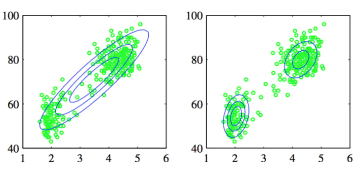 上图左面用单一高斯分布去描述,显然没有右图用两个高斯分布去描述的效果好。