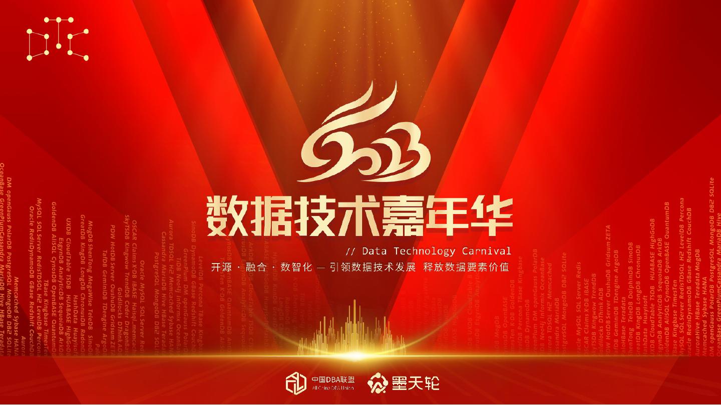 2023年4月7-8日,由中国DBA联盟(ACDU)和墨天轮社区联合主办的第十二届『数据技术嘉年华』(DTC 2023) 将在北京新云南皇冠假日酒店盛大开启。本届大会以“开源 · 融合 · 数智化 —— 引领数据技术发展,释放数据要素价值”为主题,除主论坛外,从多元化类型的数据库技术创新、应用实践、发展趋势等维度,打造12个专题论坛。大会汇聚众多优秀厂商、先进技术、卓越产品和优秀案例,来自数据领域的领军人物、学术精英、技术专家、行业实践者、生态布道者带来超过60场主题演讲,相邀数据英雄,共创数据未来!