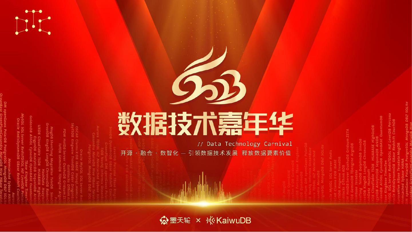 2023年4月7-8日,由中国DBA联盟(ACDU)和墨天轮社区联合主办的第十二届『数据技术嘉年华』(DTC 2023) 将在北京新云南皇冠假日酒店盛大开启。本届大会以“开源 · 融合 · 数智化 —— 引领数据技术发展,释放数据要素价值”为主题,除主论坛外,从多元化类型的数据库技术创新、应用实践、发展趋势等维度,打造12个专题论坛。大会汇聚众多优秀厂商、先进技术、卓越产品和优秀案例,来自数据领域的领军人物、学术精英、技术专家、行业实践者、生态布道者带来超过60场主题演讲,相邀数据英雄,共创数据未来!
