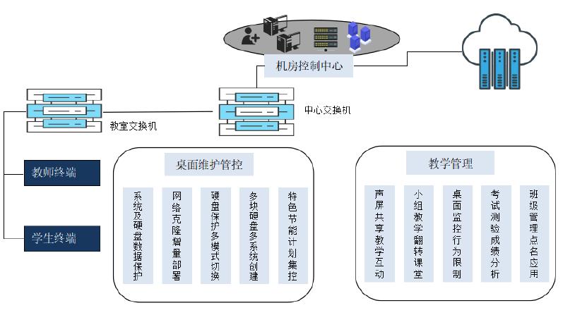 同传、多操作系统安装、双硬盘还原保护功能,搭配管理端,实现监控桌面、开关机、文