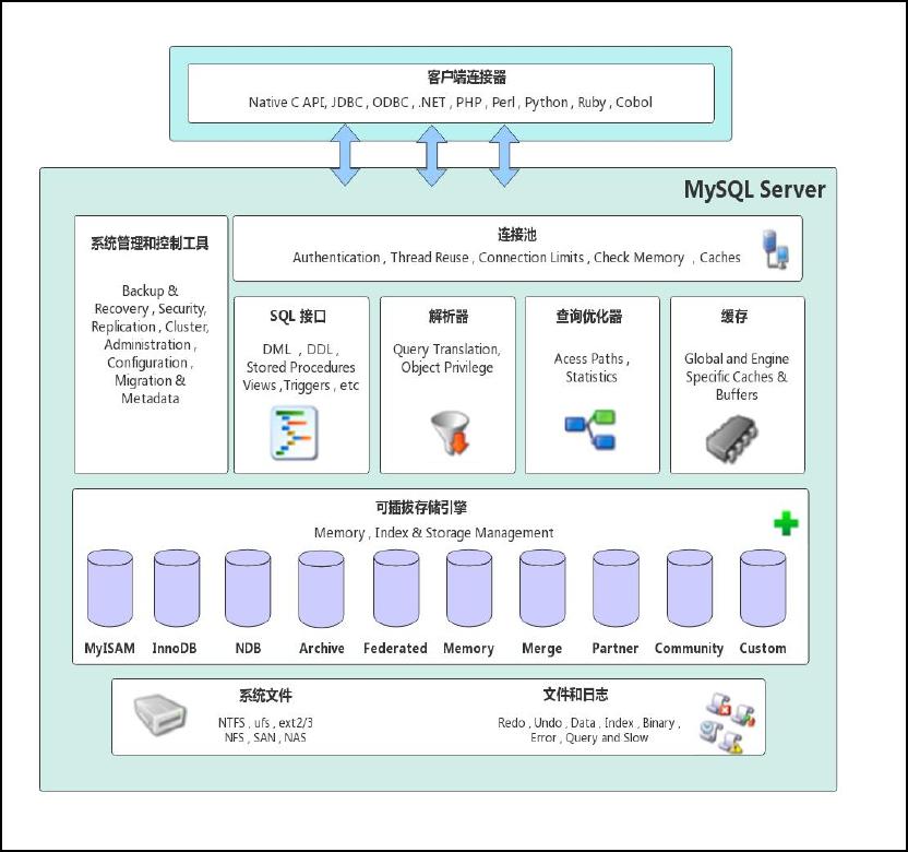 缓存(Cache&Buffer):缓存机制是由一系列小缓存组成的。比如表缓存,记录缓存,权限缓 存,引擎