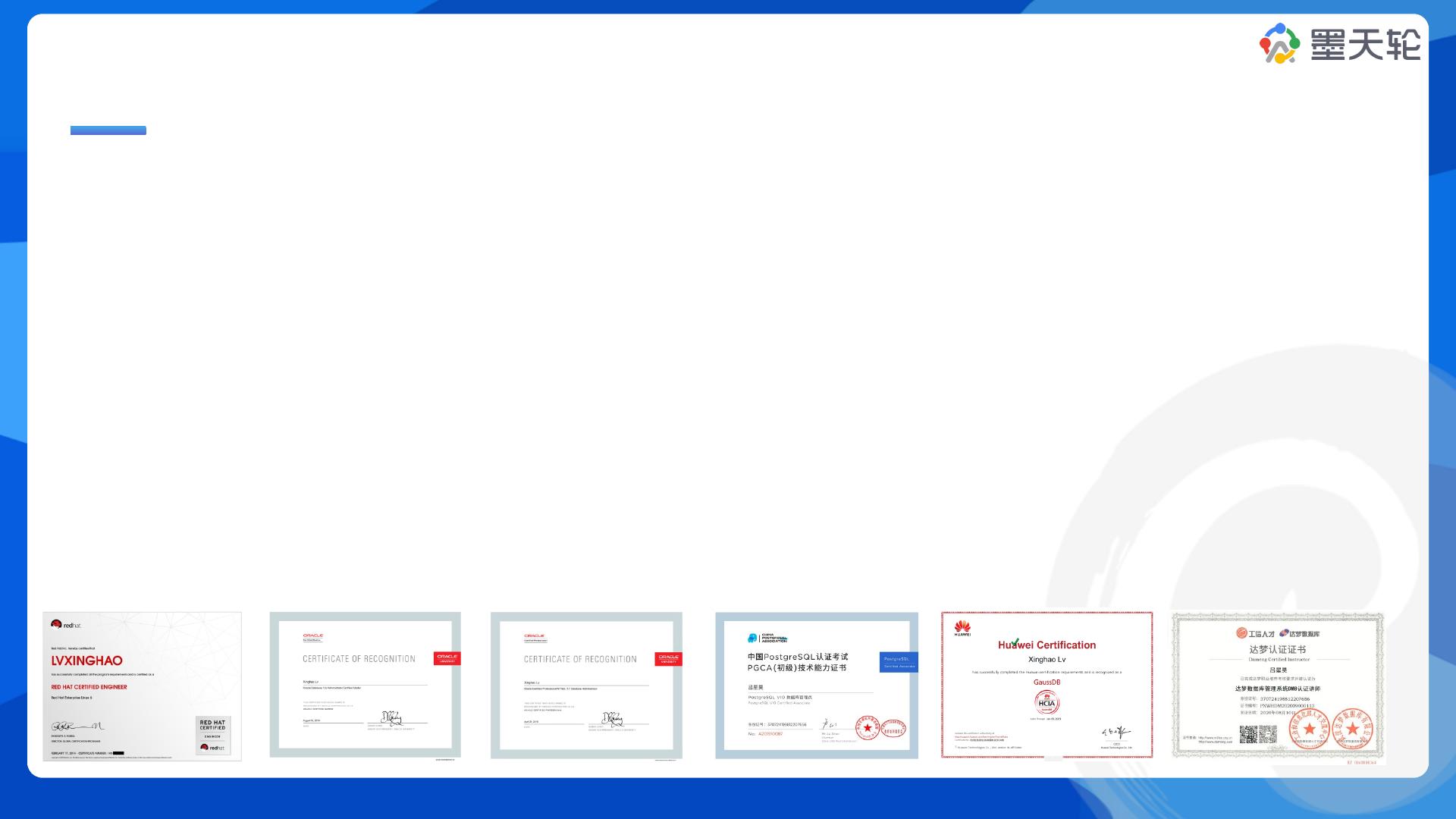 RHCE 、 PostgreSQL PGCA 、华为 GaussDB HCIA 、 OceanBase OBCP 。