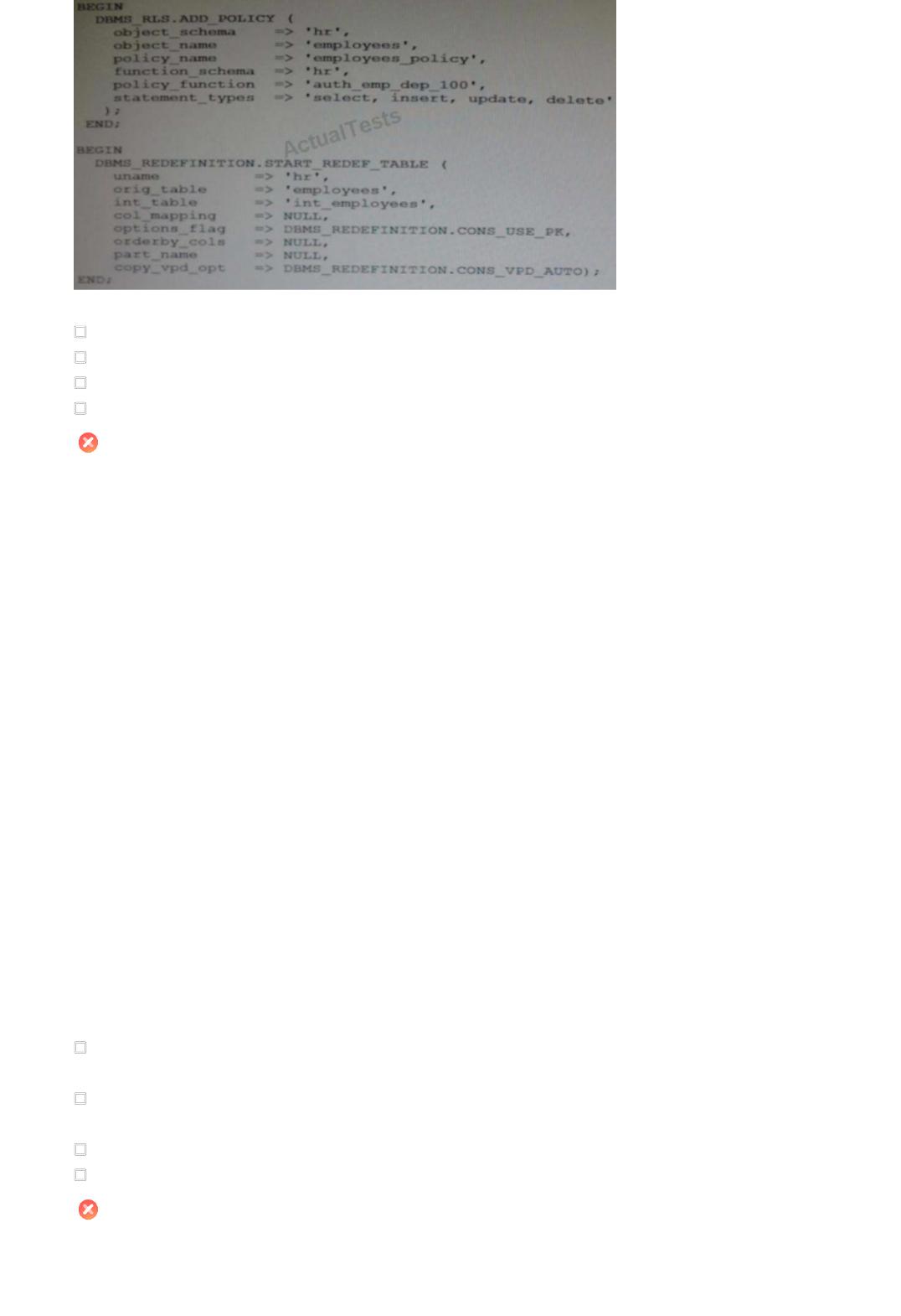 B. The primary key constraint on the EMPLOYEES table is disabled during redefinition.┋C. VPD policies are copied fro