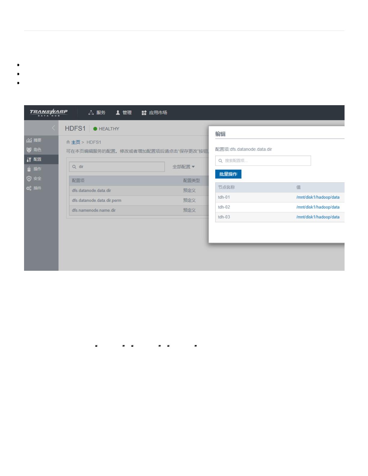 先检查磁盘是否作为集群hdfs、inceptor、yarn组件的数据盘或者元数据盘在使用,相关的服务以及配置项: