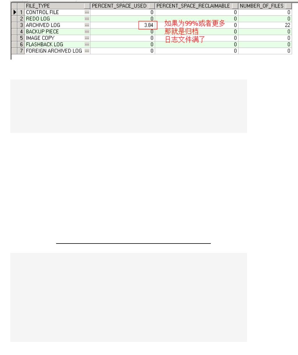 志,那么就是归档日志文件写满的缘故了。使用以下几个命令可以看出当前归档日