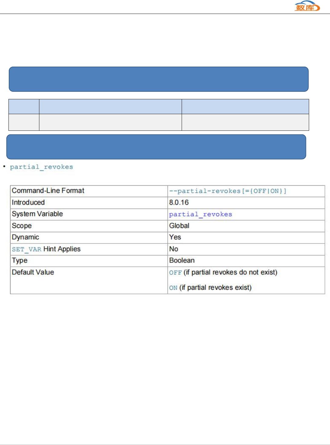partial_revokes 系统变量控制着是否可以对帐户施加权限限制。默认情况下,partial_revokes 被禁用,尝试部分撤销全