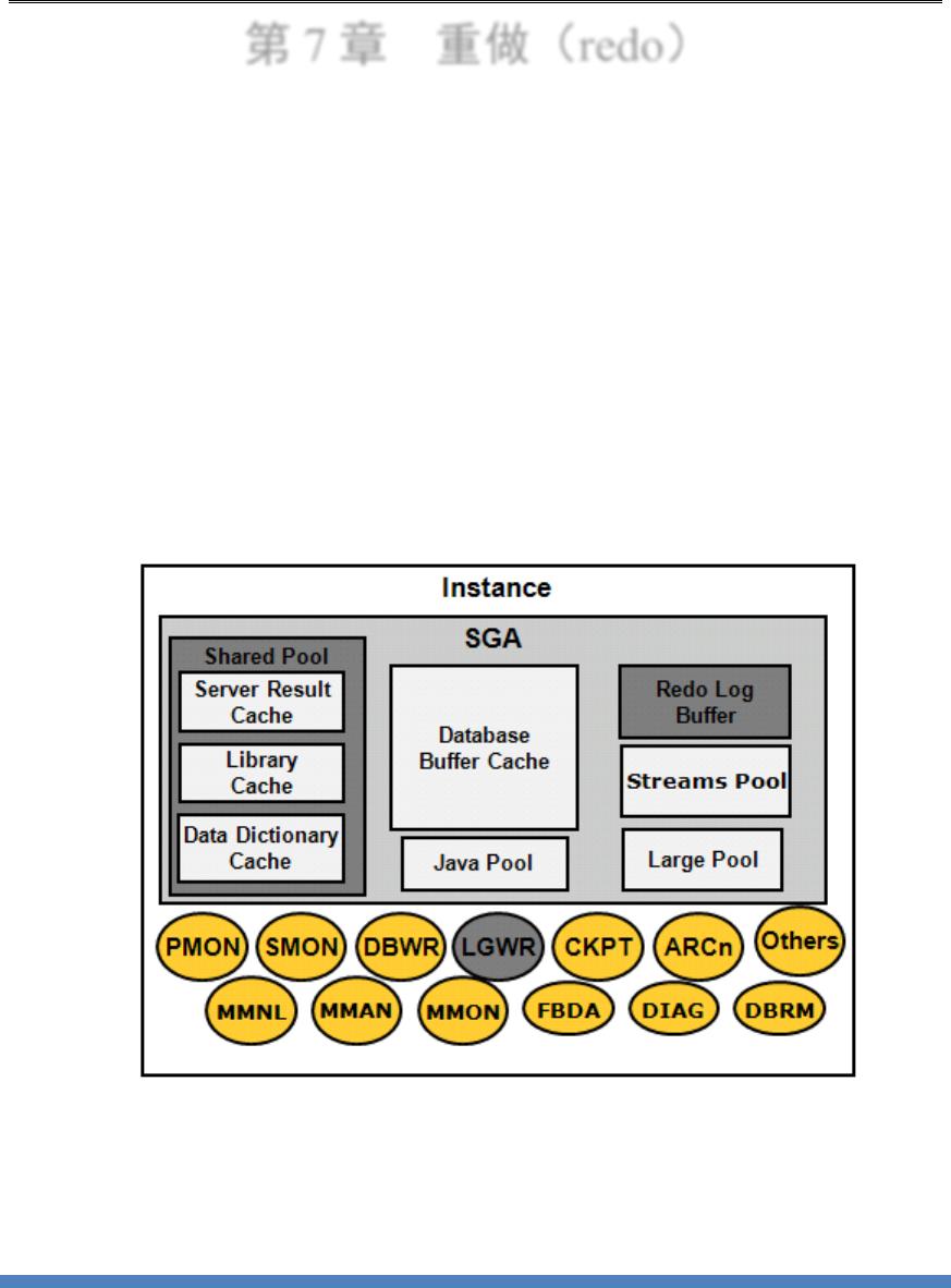 图 7-1 是 Oracle 的数据库实例示意图,Redo Log Buffer 以及 LGWR 进程在图中皆有体现: