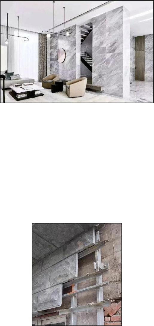 通过基层骨架与墙体固定,然后用干挂件把开槽的石材挂在骨架上的一种工艺。