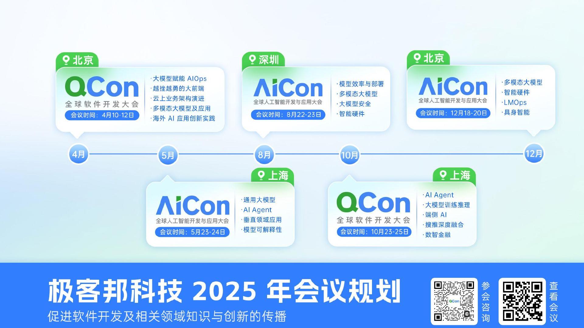 2024年12月13日 - 12月14日 | 北京。AICon 全球人工智能开发与应用大会是由极客邦科技旗下 InfoQ 中国主办的人工智能和大模型技术盛会,主要面向各行业对人工智能和大模型感兴趣的资深工程师、产品经理、数据分析师,会议聚焦大模型训练与推理、AI agent、RAG、多模态大模型等热门方向,会议不仅安排了精彩的演讲,还策划了包括闭门会议、圆桌交流、互动展区等多种社交活动,一方面为参会人员提供宝贵的交流学习、拓展人脉的机会,另一方面也为相关企业和机构提供一个展示自身实力和成果的舞台。