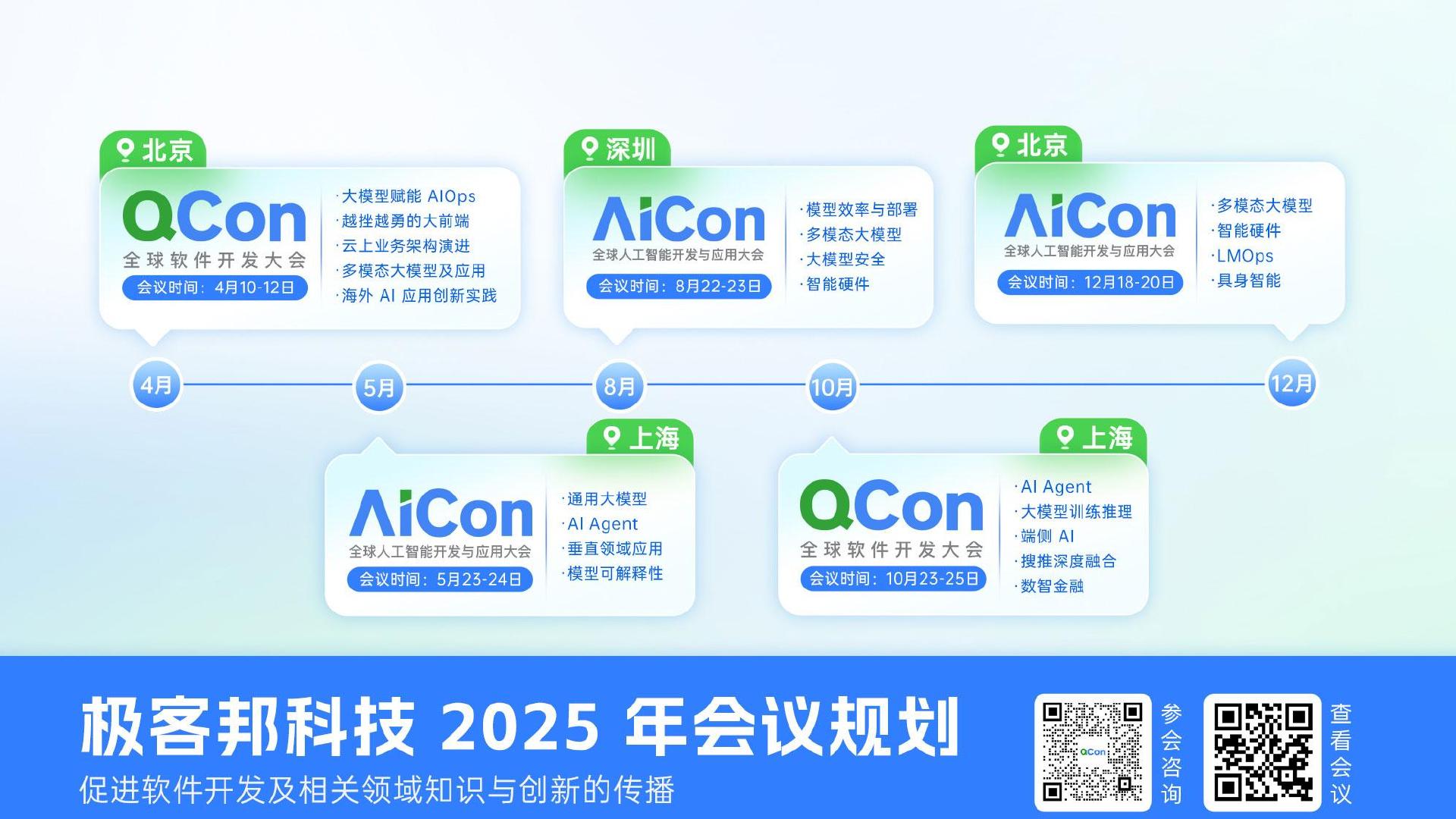2024年12月13日 - 12月14日 | 北京。AICon 全球人工智能开发与应用大会是由极客邦科技旗下 InfoQ 中国主办的人工智能和大模型技术盛会,主要面向各行业对人工智能和大模型感兴趣的资深工程师、产品经理、数据分析师,会议聚焦大模型训练与推理、AI agent、RAG、多模态大模型等热门方向,会议不仅安排了精彩的演讲,还策划了包括闭门会议、圆桌交流、互动展区等多种社交活动,一方面为参会人员提供宝贵的交流学习、拓展人脉的机会,另一方面也为相关企业和机构提供一个展示自身实力和成果的舞台。