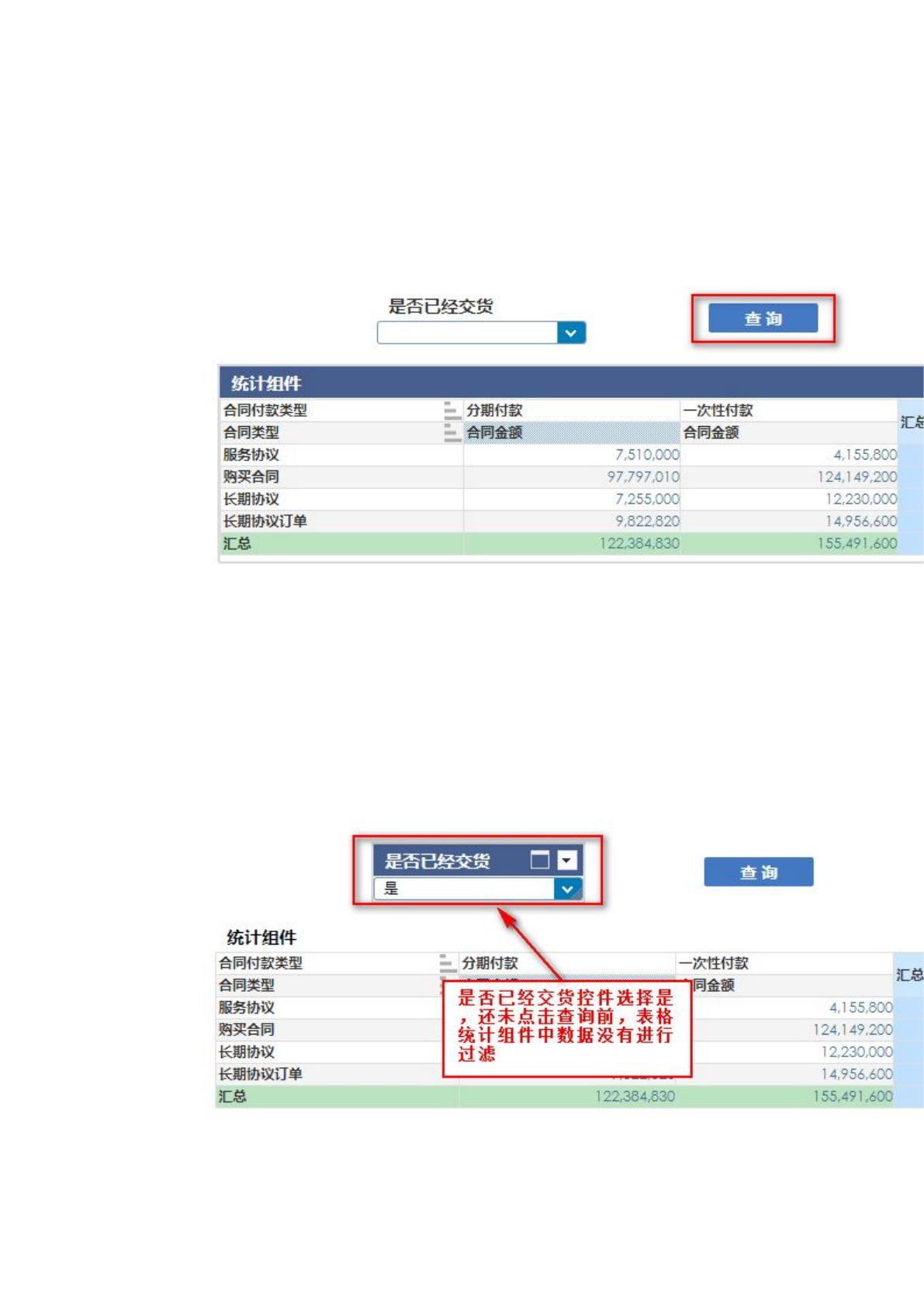 此时,如果选择是否已经交货控件中的值,表格组件中的数据会自动查询。